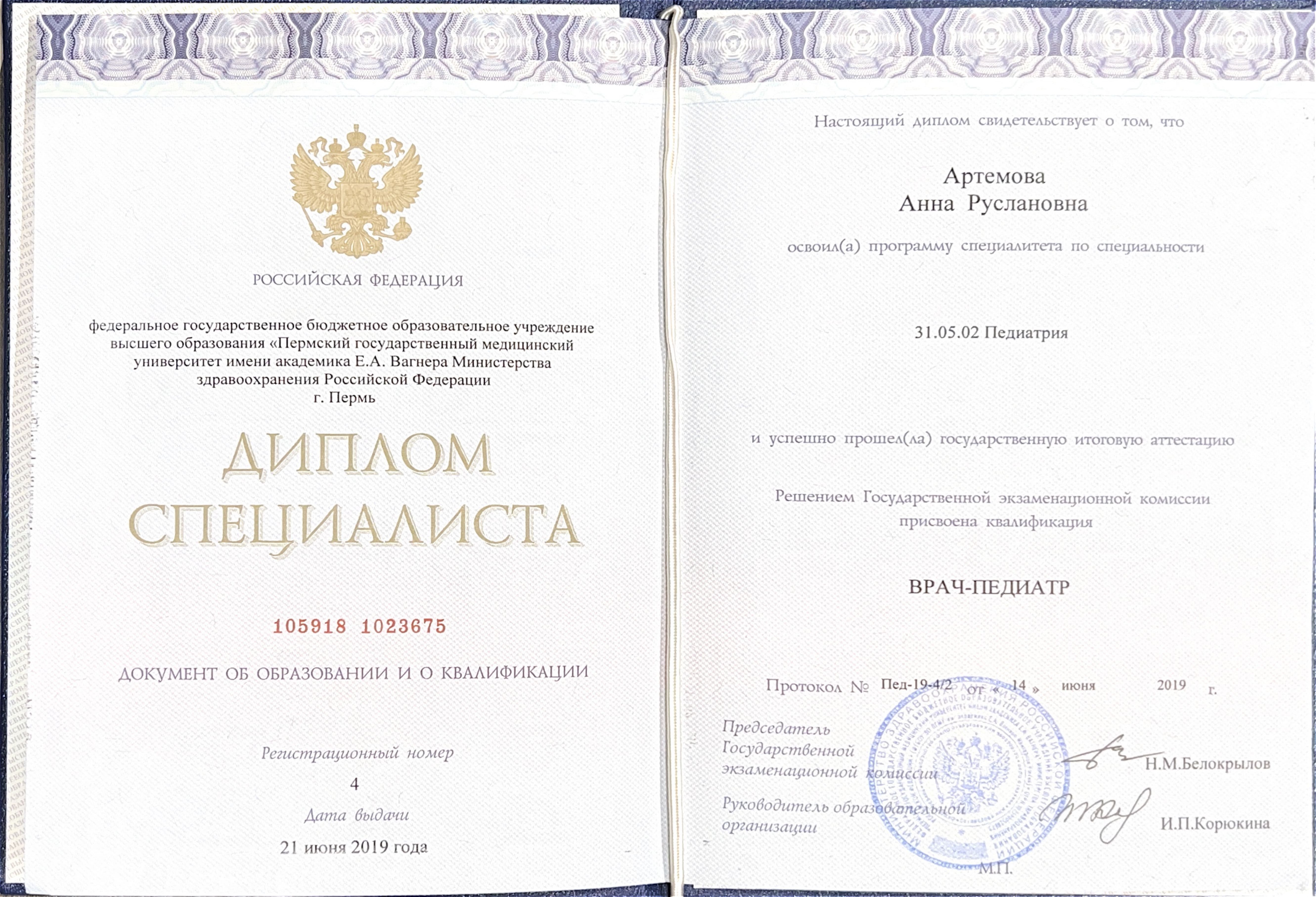 2019 г. - окончила Пермский государственный медицинский университет им. акад. Е.А. Вагнера по специальности "Педиатрия"